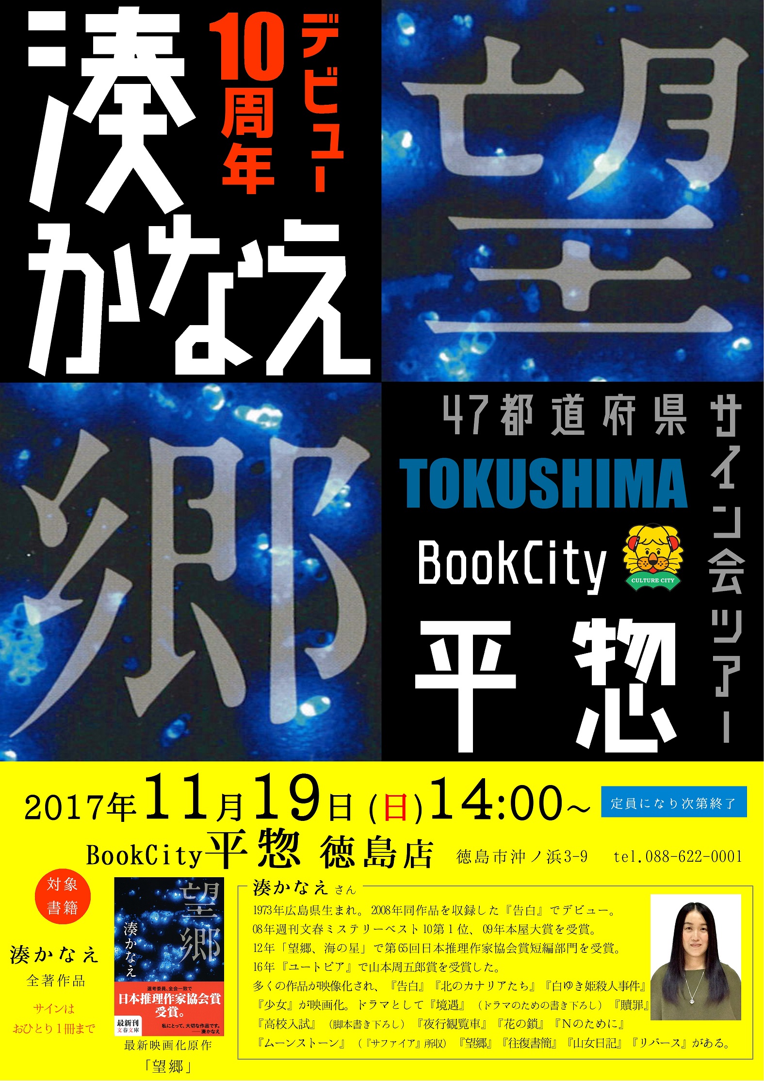 イベントのお知らせ 2017年10月2日 リーダーズの輪 11月19日、平惣徳島店イベントスペースにて湊かなえ先生のサイン会を行います。たくさんの作品が映画化されている大人気の作家さんです。参加には整理券が必要となります。詳しくはホームページか平惣各店でお問い合わせください。 「サイン会のお知らせ 」